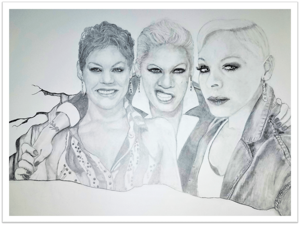 Growing as an artist. Three faces of P!nk. P!nk has been my most challenging person to draw, thus far. So, I keep drawing her. This drawing was done in 2021. Some of you will appreciate my story: My original idea was to drape the middle P!nk over the younger and current P!nk; however, the middle P!nk was so forceful the drawing dictated that I draw her showing the middle finger. I used my hand as a guide to draw a hand on the younger P!nk to hold the middle P!nk’s hand so that I would not have to draw the middle finger. I am sure either rendition would have worked. But if I had it to do all over again, I would have listened to what the original drawing dictated to me because that would have been the most honest rendition. Share your thoughts in the comment section below.